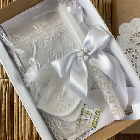 Junto com a toalha, é possível ter uma vela de batismo com bordado, aplicação do Espírito Santo e decoração diferenciada com Renda Renascença. Algumas igrejas podem ter uma vela padrão para a cerimônia, nesse caso, verifique na paróquia para descobrir qual a norma do local.