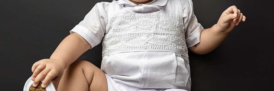 O traje infantil para batizado normalmente é na cor branca e é recomendado que ele tenha uma abertura na frente para facilitar os procedimentos do batismo.